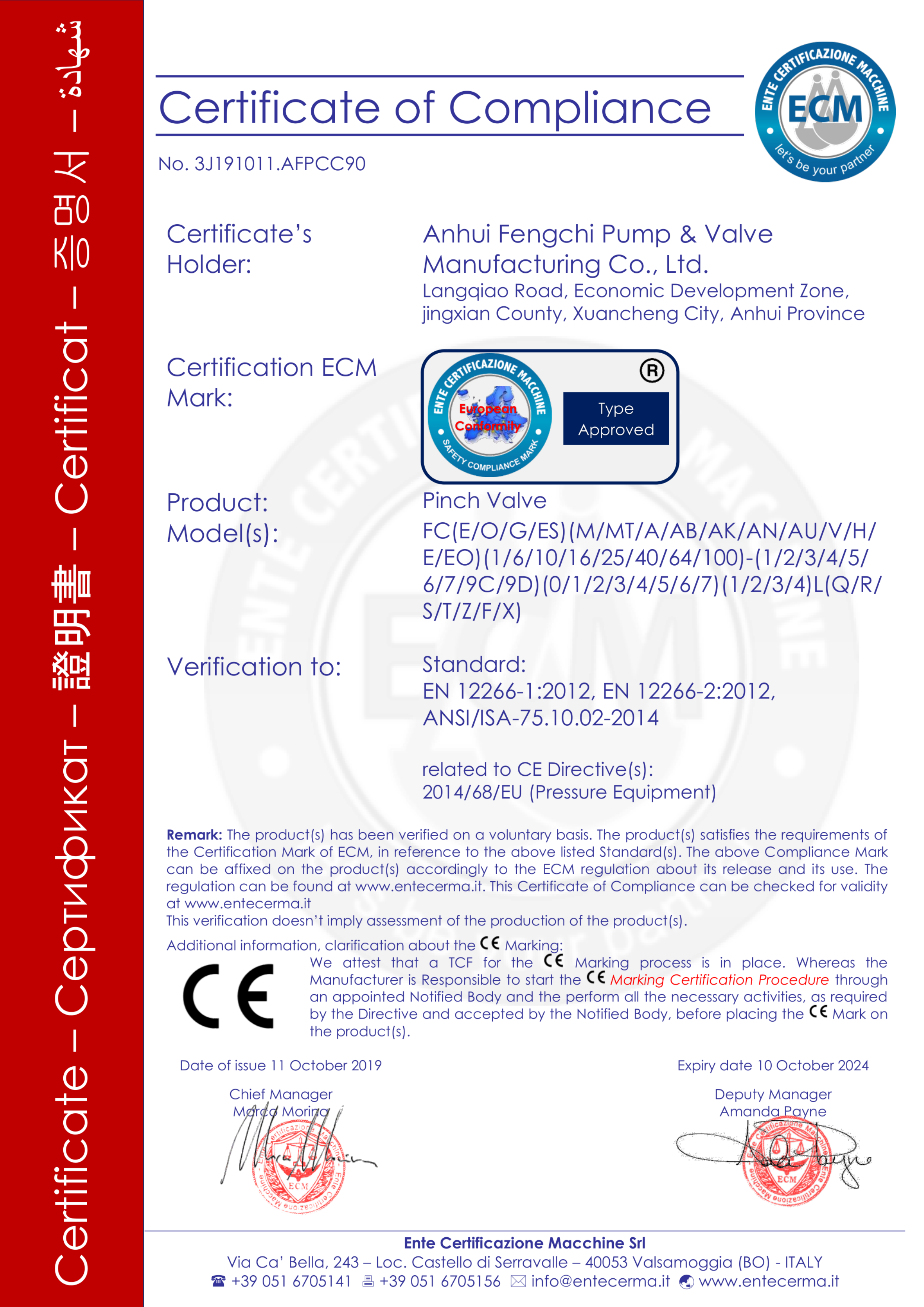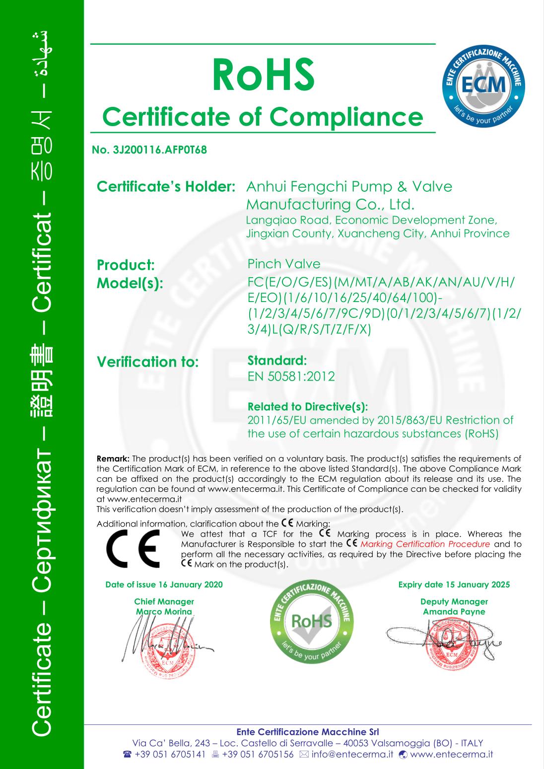 มณฑลอานฮุย Fengchi ปั๊มวาล์วผลิต Co., Ltd. ผ่านการรับรองระบบการจัดการคุณภาพ ISO9001-2015 ระบบการจัดการสิ่งแวดล้อม ISO14000 ระบบการจัดการอาชีวอนามัยและความปลอดภัย ISO45001 การรับรอง CE ของสหภาพยุโรป และการรับรอง Rohs ตามลำดับ